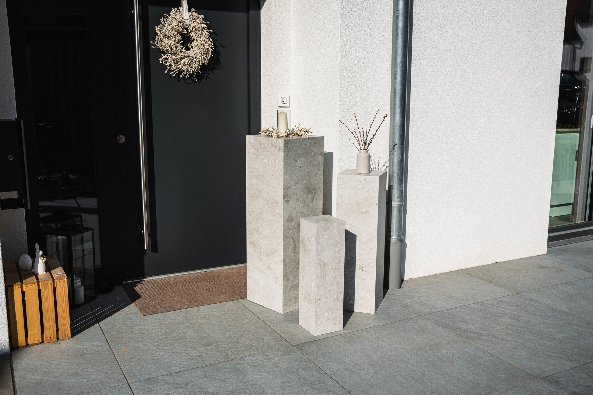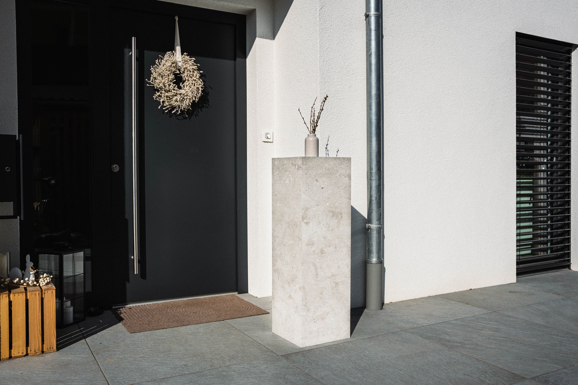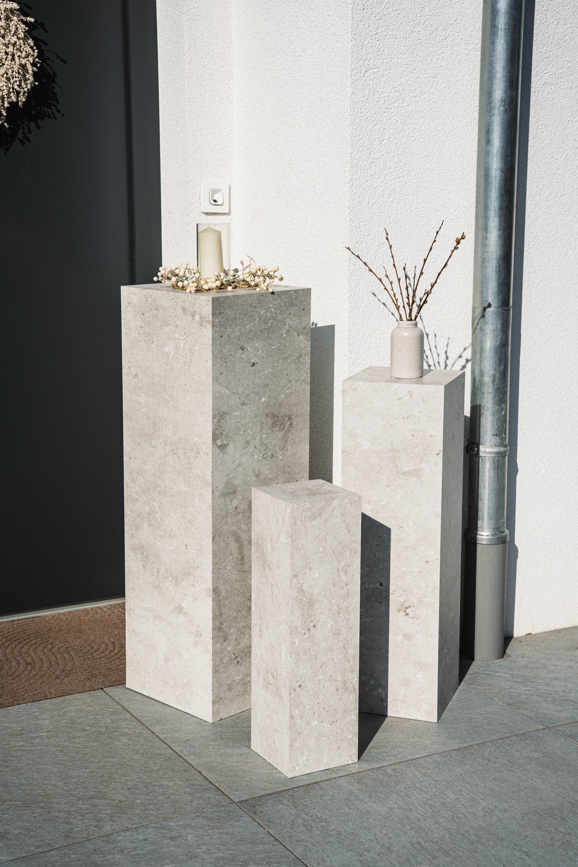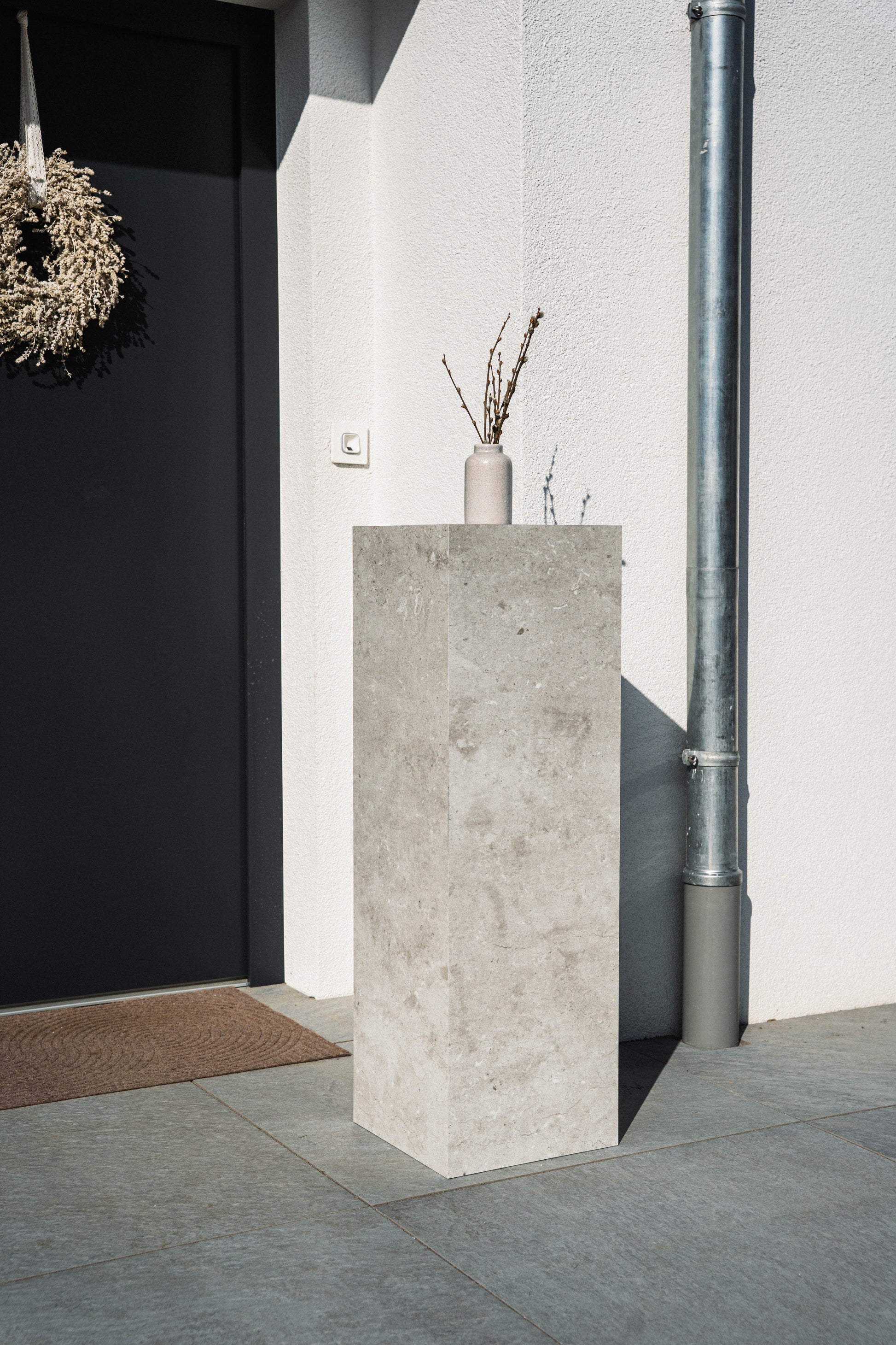 Gefertigt aus einem robusten Mix aus Marmorgranulat und recyceltem Polymer, ist die Säule nicht nur langlebig, sondern auch pflegeleicht und umweltbewusst. Die Oberfläche ist wasser- und schmutzabweisend, bleibt farbecht bei Sonneneinstrahlung und trotzt Wind und Wetter.