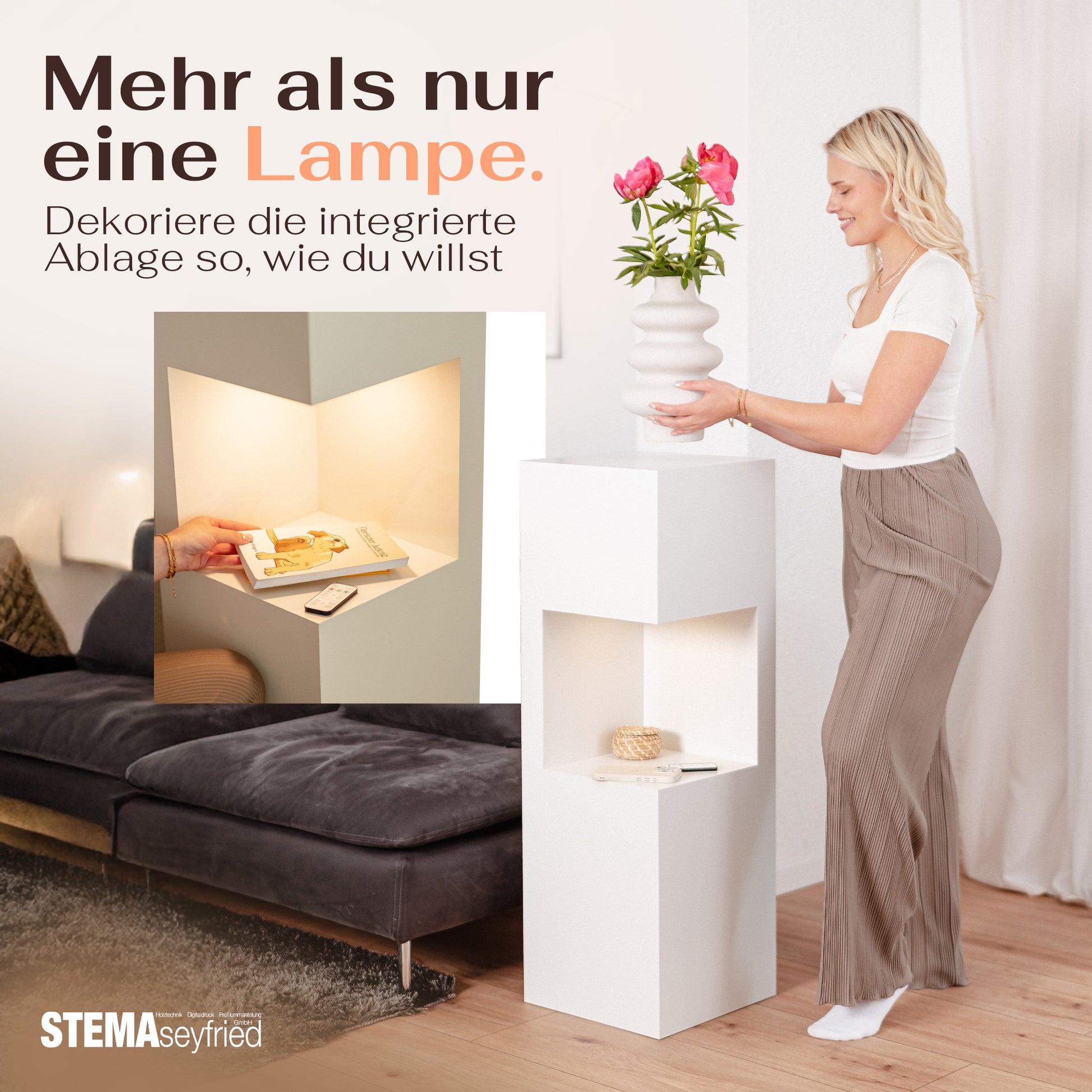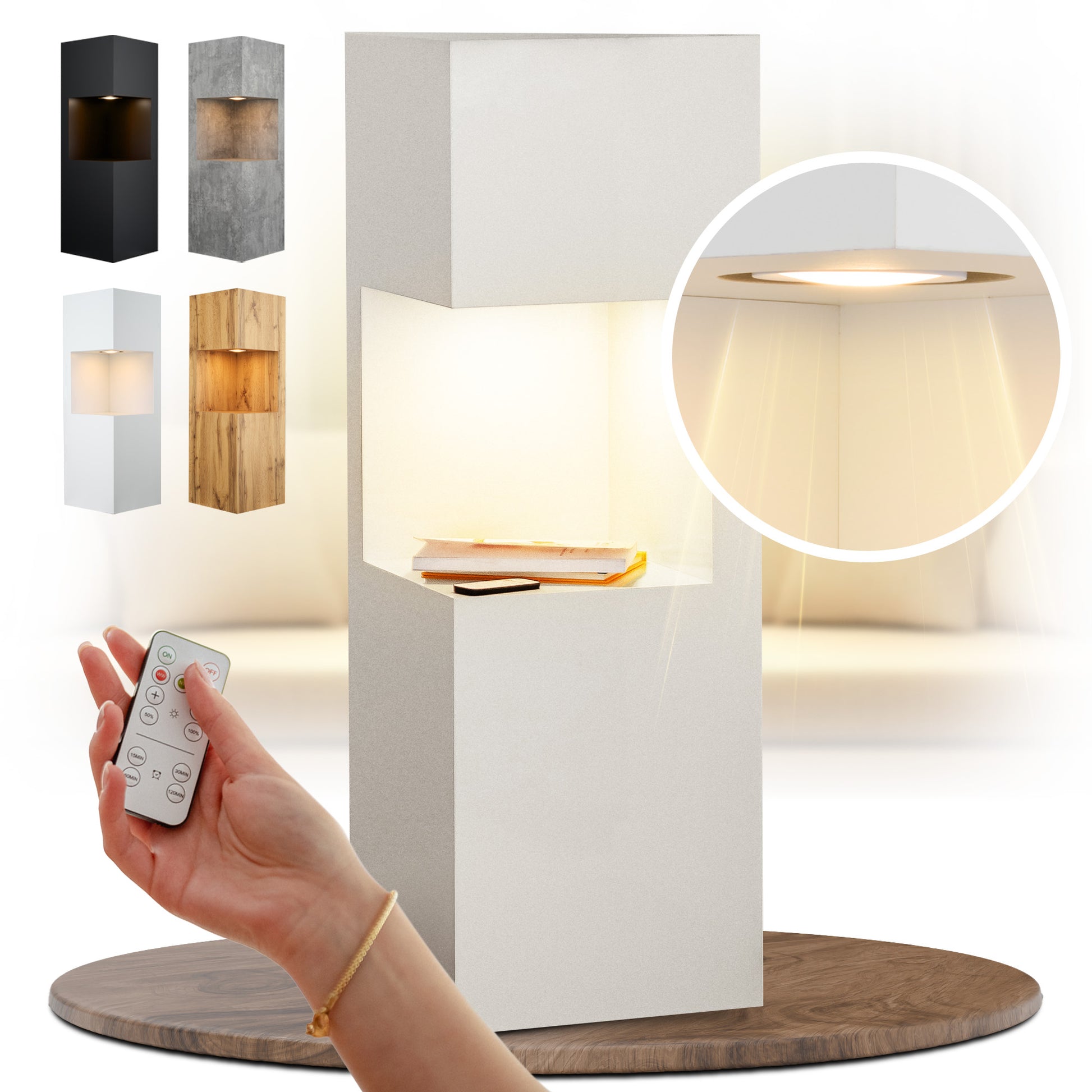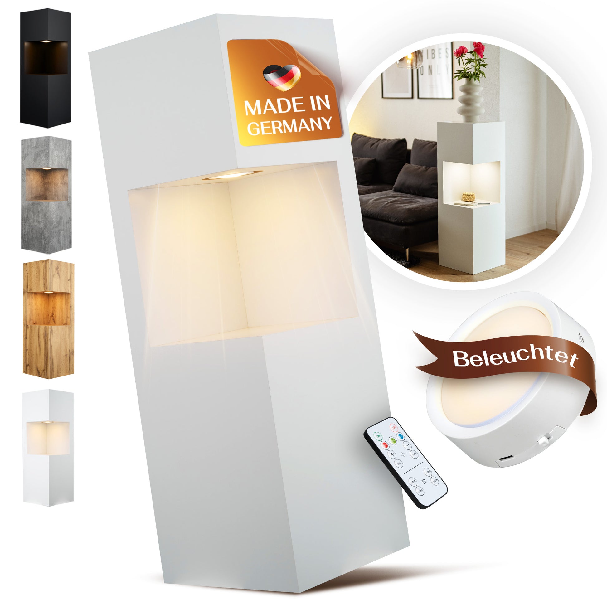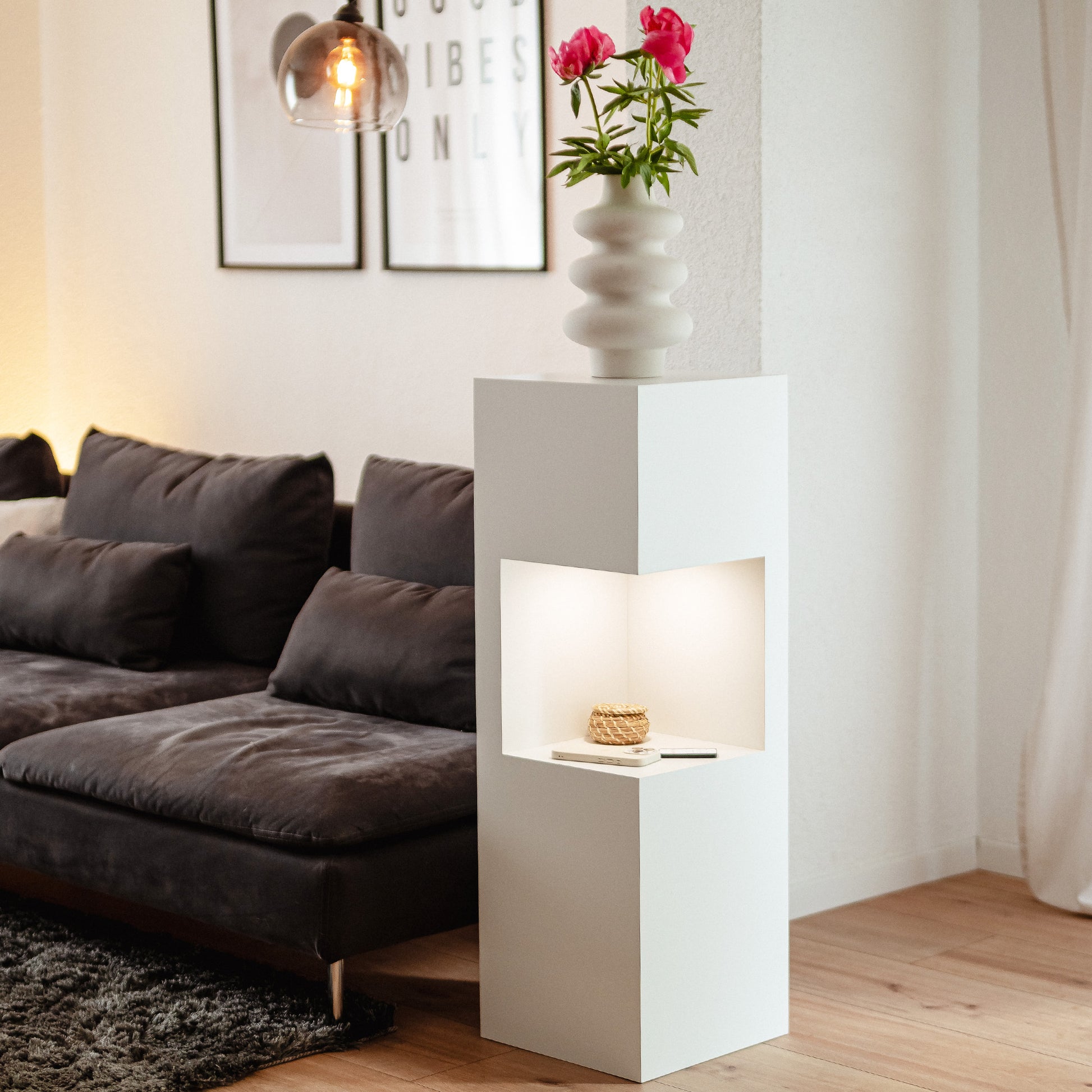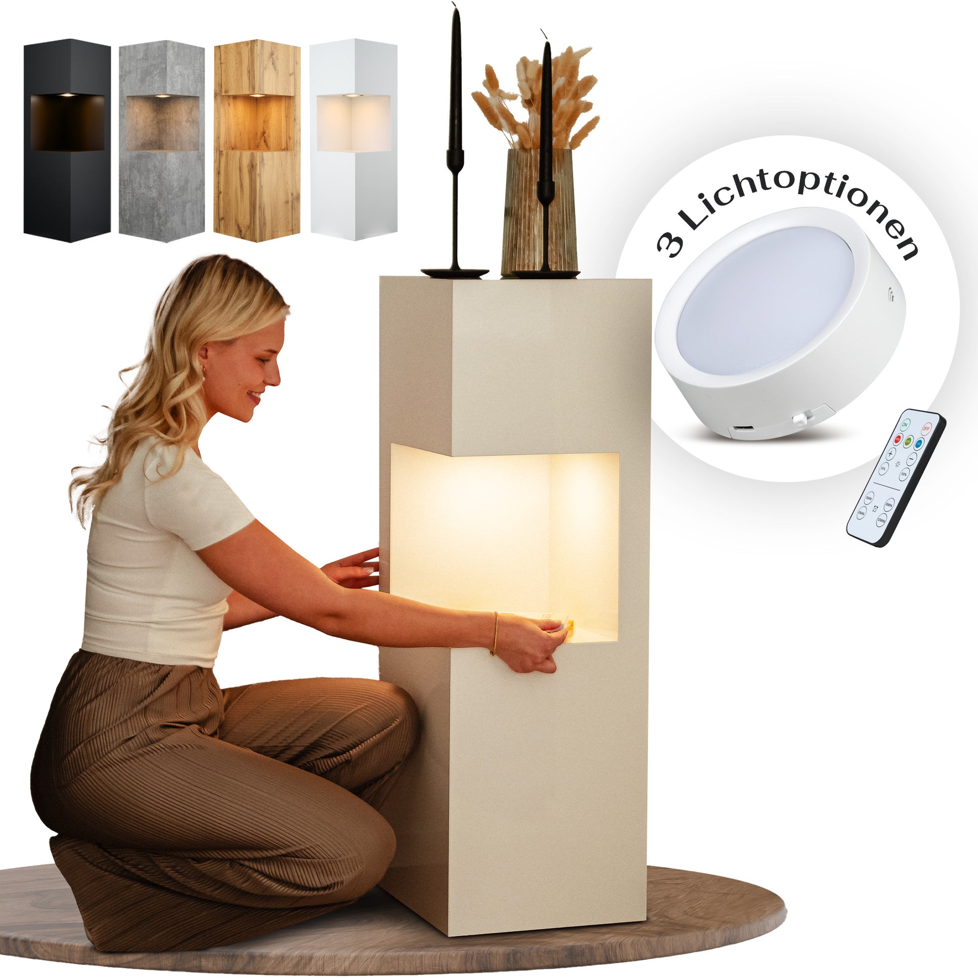 Die beleuchtete Dekosäule verbindet stilvolle Präsentation mit smarter Beleuchtung. Die integrierte LED-Nische bringt besondere Stücke – Erinnerungen, kleine Skulpturen, Vasen oder Pflanzen – wirkungsvoll zur Geltung. Dank austauschbarer, akkubetriebener Lampen platzierst du die Säule frei im Raum, ganz ohne sichtbare Kabel.