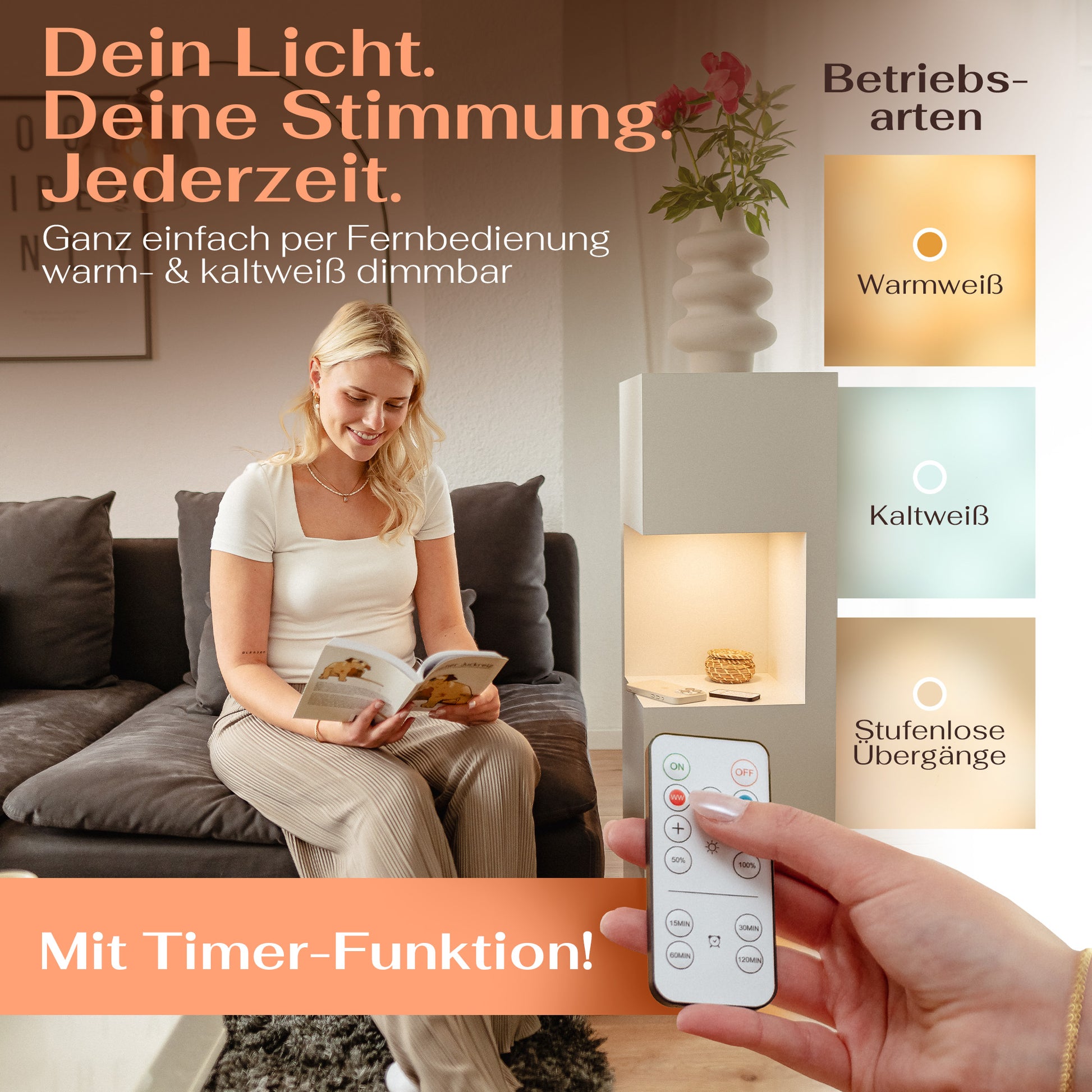 Per Fernbedienung wechselst du bequem zwischen mehreren Helligkeitsstufen und 3 Lichtfarben – so entsteht in Sekunden die passende Stimmung für Alltag, Besuch oder besondere Anlässe.