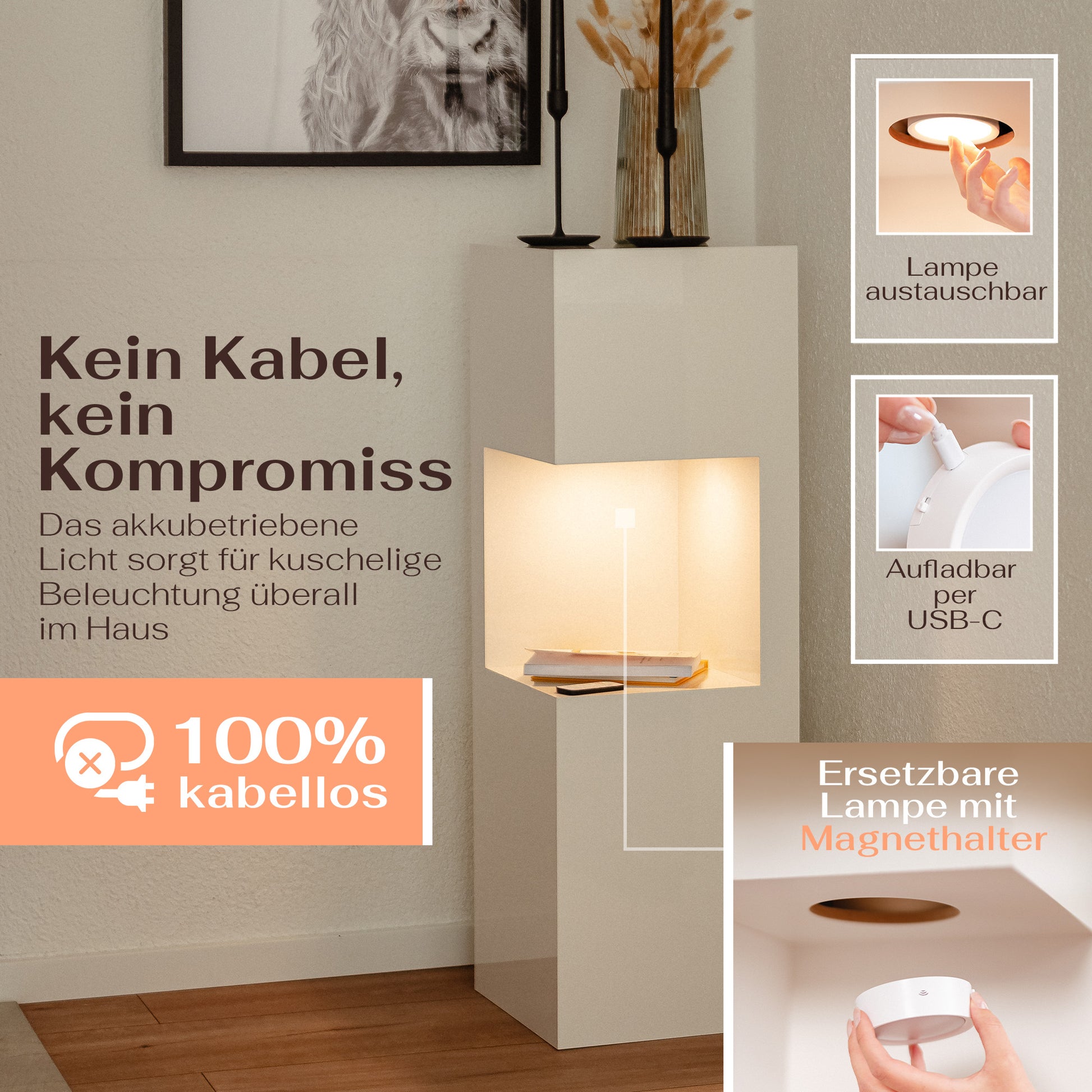 - 🔋📲 Flexibel dank Akku & Fernbedienung: Austauschbare, akkubetriebene Lampe mit mehreren Helligkeitsstufen – komfortabel per Fernbedienung steuerbar, ohne Steckdose am Aufstellort.