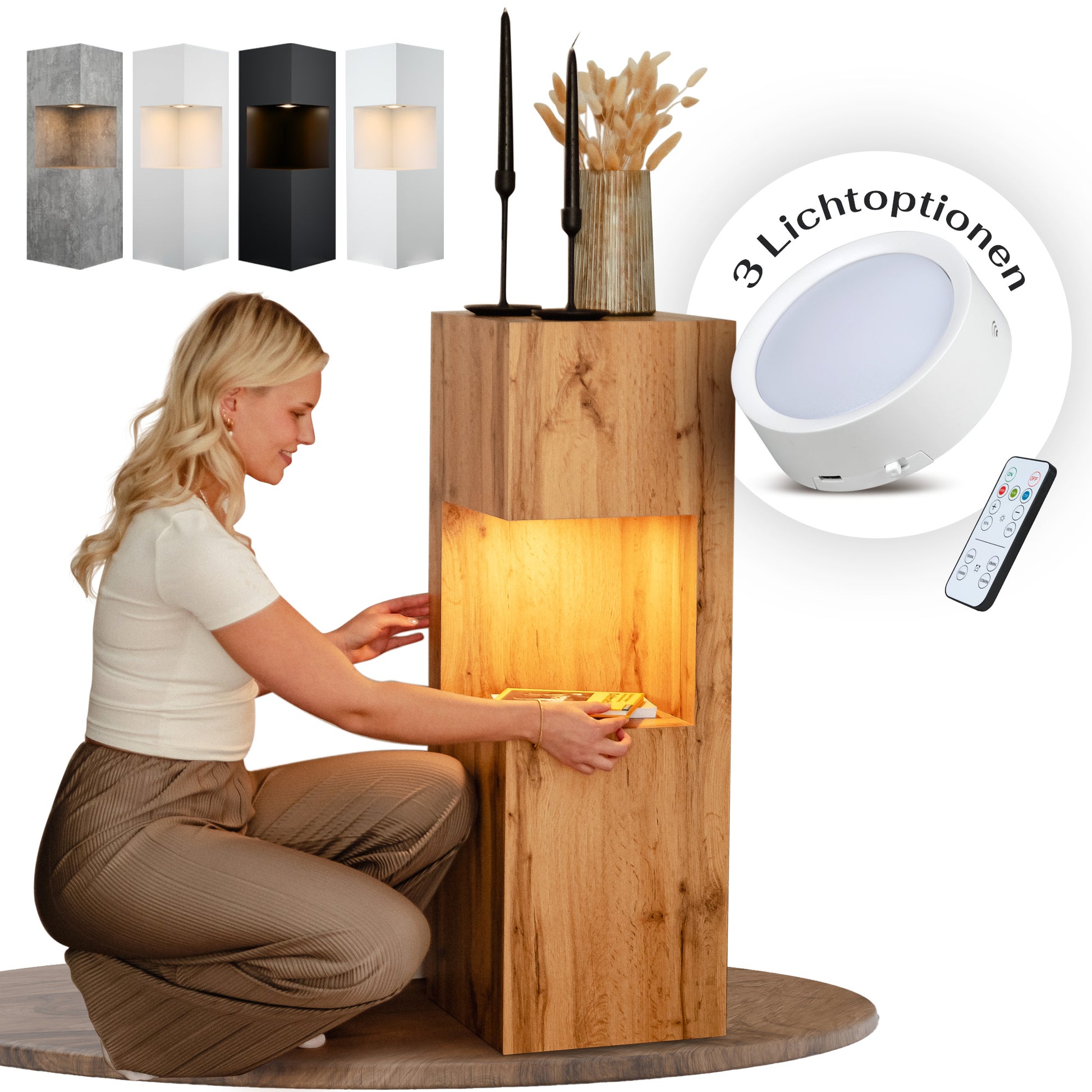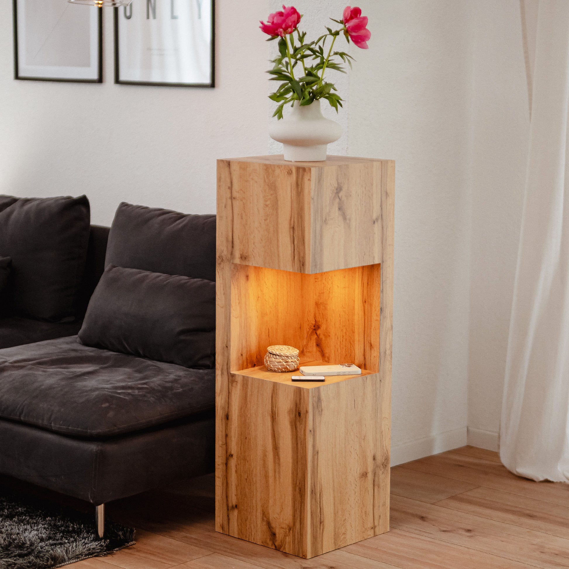 Die beleuchtete Dekosäule verbindet stilvolle Präsentation mit smarter Beleuchtung. Die integrierte LED-Nische bringt besondere Stücke – Erinnerungen, kleine Skulpturen, Vasen oder Pflanzen – wirkungsvoll zur Geltung. Dank austauschbarer, akkubetriebener Lampen platzierst du die Säule frei im Raum, ganz ohne sichtbare Kabel.