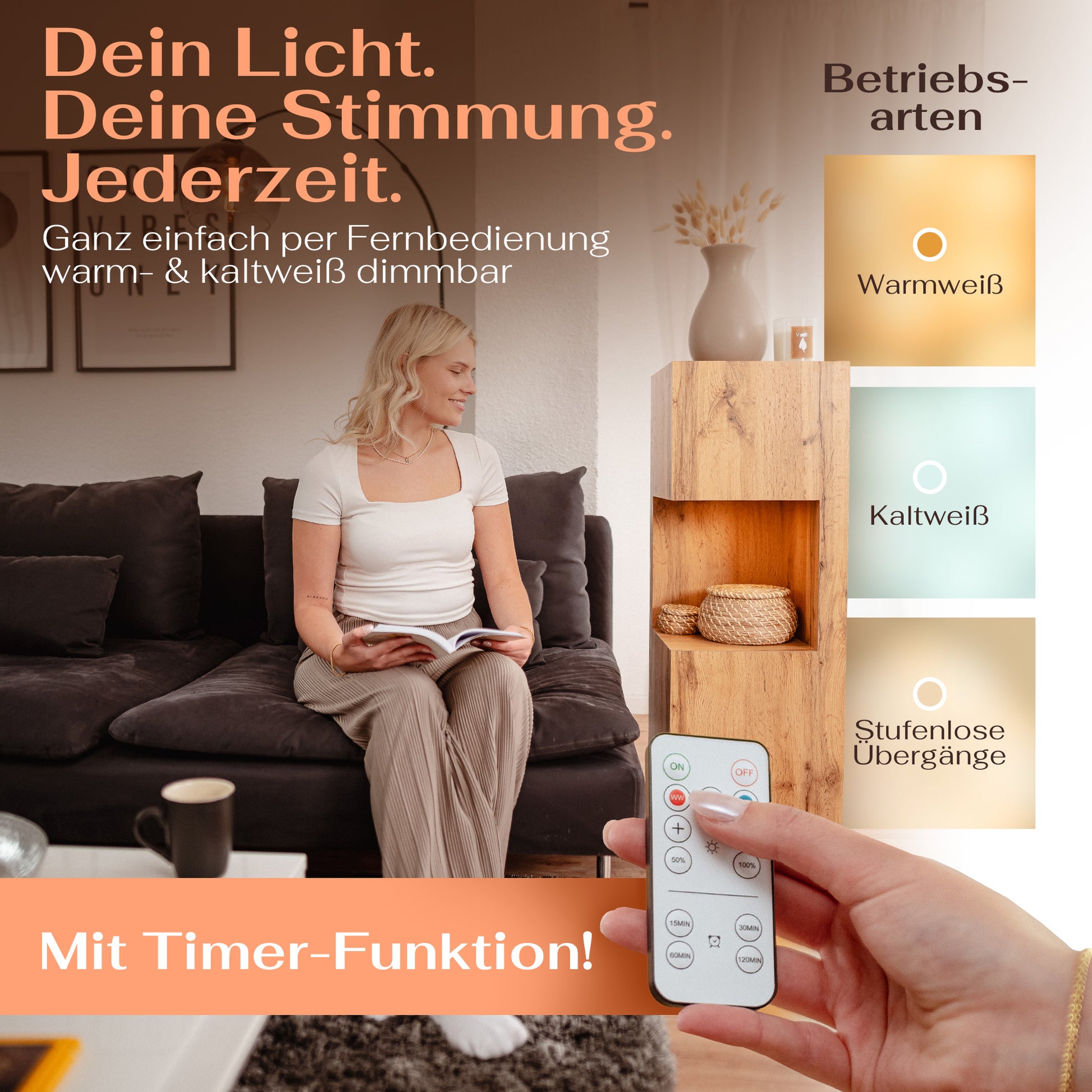 Per Fernbedienung wechselst du bequem zwischen mehreren Helligkeitsstufen und 3 Lichtfarben – so entsteht in Sekunden die passende Stimmung für Alltag, Besuch oder besondere Anlässe.