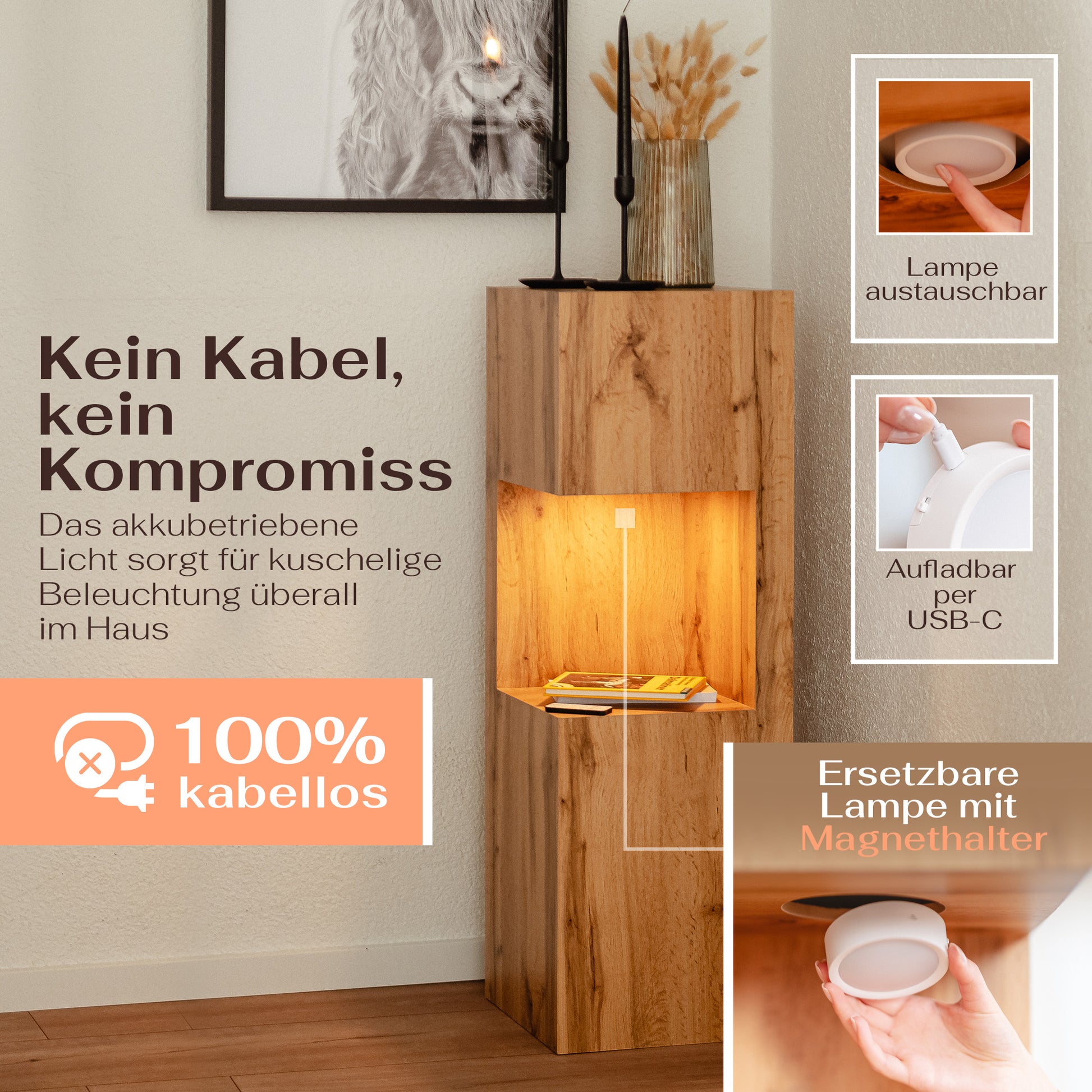 - 🔋📲 Flexibel dank Akku & Fernbedienung: Austauschbare, akkubetriebene Lampe mit mehreren Helligkeitsstufen – komfortabel per Fernbedienung steuerbar, ohne Steckdose am Aufstellort.